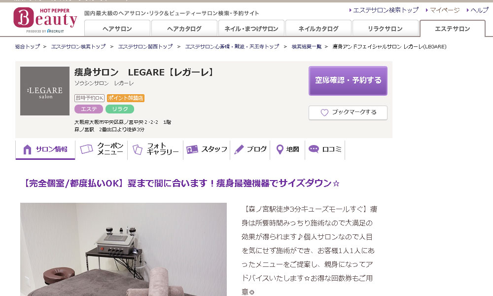 大阪森の宮にある『痩身アンドフェイシャルサロン レガーレ(LEGARE)』は大人の女性のための痩身サロンとして人気が高くなっています。